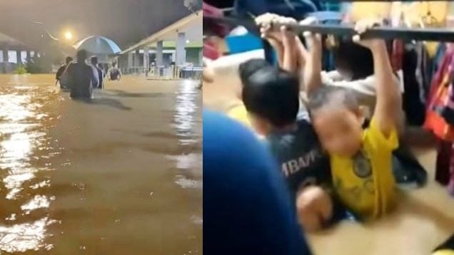 洪水来袭水位高涨,甘文丁住宅区一群孩童被迫抓紧衣架,以免被湍急的洪流冲走,场面惊险。