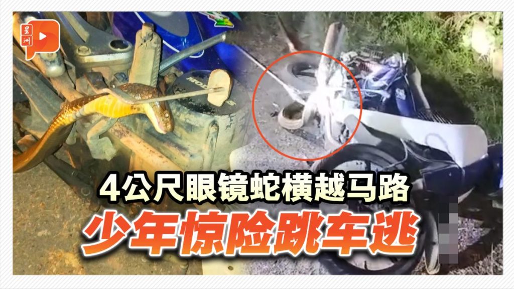 16岁吉打锡县少年骑摩托返家途中,遇上长达4公尺的眼镜王蛇横越马路, 吓得他跳车逃命。没想到巨蛇竟被卡在摩托的刹车装置里。所幸消防员及时赶抵,成功将其捕获。