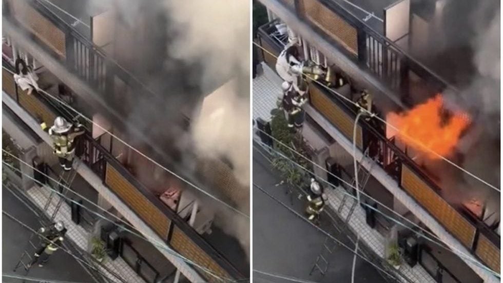 日本大阪市一间公寓发生火灾,一名受困阳台的年轻女子因极度惊恐,不但拒绝救援,还在关键时刻一脚把消防员踢下云梯,引发全网震惊。