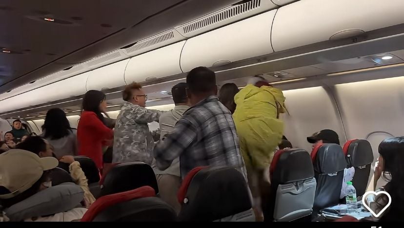 乘客在亚航飞机上打架 边劝架边安抚 空服员好忙