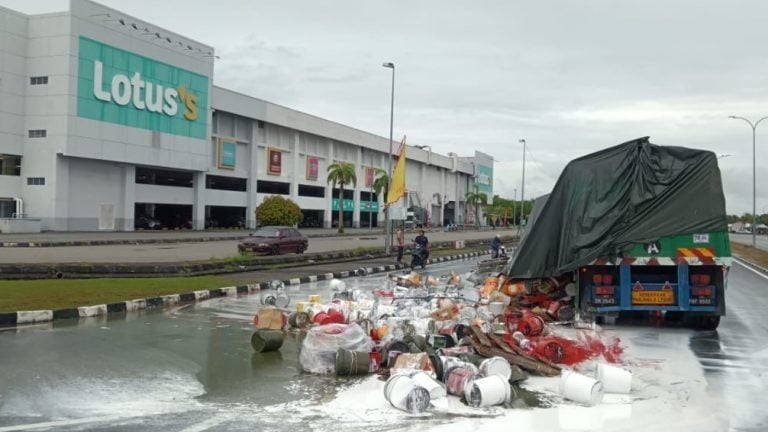 一辆载有油漆桶的拖格罗里在驶入默贡莲花霸级市场的交通灯处时,疑车身偏移后失衡,导致车上油漆全撒落满地造成路面湿滑。为安全起见,警方关闭该路段进行清理工作。