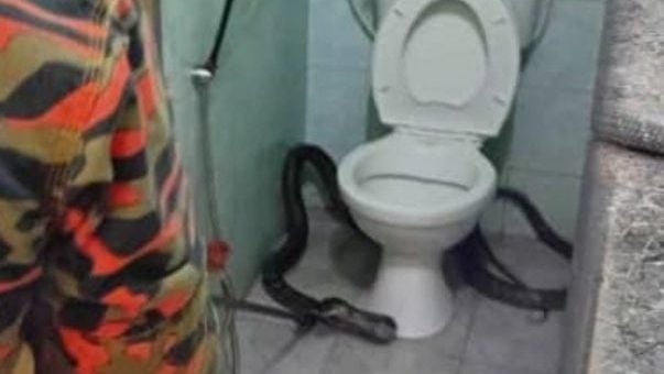 约70岁的老妇打开厕所门时,赫然见到一条长约5公尺的眼镜王蛇盘踞其中,吓得连忙退后,并立即联络儿子,再由家属向消拯局求助