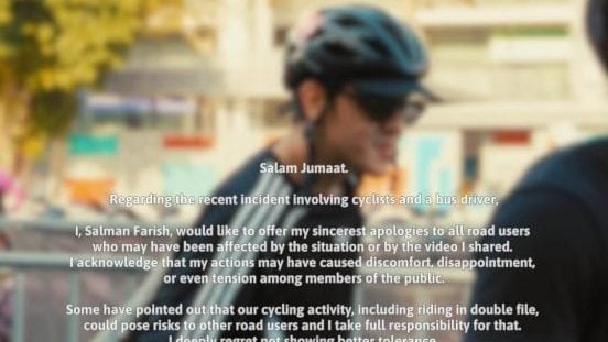 巴士司机和一群脚踏车骑士在瓜拉雪兰莪路上起争执事件发酵后,上传视频的骑手发帖道歉和认错,承认在公路上骑脚踏车为他人带来风险,并希望事件能作为前车之鉴,带着更多同理心和责任感,建设一个更和谐团结的大马。
