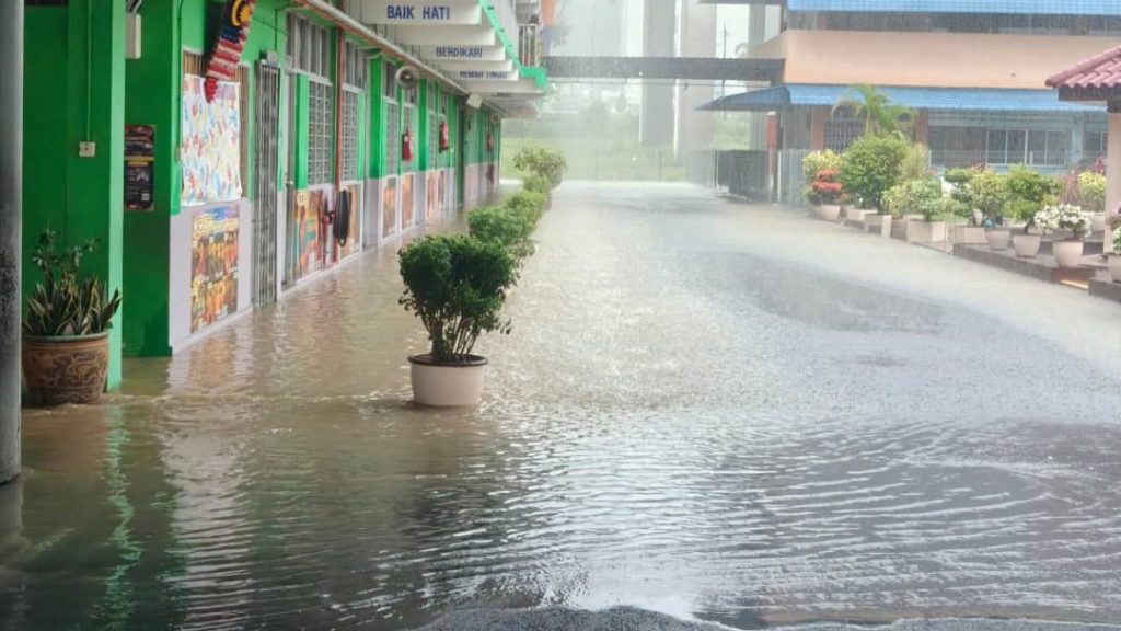 (居銮14日讯)居銮午间下了一场倾盆大雨,明吉摩河水位一度暴涨,多条道路也出现积水现象,居銮中华一和二小校园也被洪水涌入,其中中华二小的底层教室也“泡水”。 这场暴雨在下午1时许开始,一直延续到接近下午4时才逐渐停歇。 居銮中华一二小校园在下午3时左右开始积水,从后方高架铁道处沟渠的洪水,从一个缺口处进入校园。 其中中华一小的停车场和一间厕所受到影响,中华二小则除了停车场和走道,底层的4间课室和学生厕所也受到影响,但水位并不高,只有浅浅的一层水。 一小校长陈玡好透露,之前校园后方有一个挡水墙,但近期因沟渠工程而拆除,导致积水如和瀑布般涌入。 她表示,当时自己在楼上目睹水位不断上升,大家也赶紧到停车场把各自的车移开,而当时的水位已经到达脚踝上方。 因此,她希望这个挡水墙能尽快重建,避免类似事件再次重演。 二小校长张薰今则透露,涌入校园内的水好像瀑布一般又急又快,所幸淹入课室的水位不高,大约20分钟后就逐渐消退。 她说,水退了后她和教职员也都在忙着清扫。 2位校长皆透露,明吉摩州议员周忠信、居銮中华二小董事长戴国光和承包商都已到校视察。 除了中华一二小,勿刹路、中华路、丰盛港路、宜康省旁的小路等道路,也都出现积水,但在雨停后积水都已消退。
