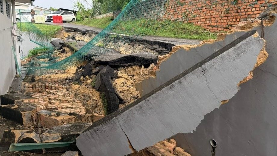 (古来10日讯)午后下起豪雨,一房屋后巷的马路下陷崩塌,导致房子的墙壁也被“推倒”,所幸未造成人命伤亡。 这起事件是于今天约下午4时,在古来新村令孔路一房屋后巷发生,该房子住着60余岁的二男一女,皆已退休。 古来新村村长曾伟力在接受星洲日报《社区报》访问时表示,他是在下午4时43分接获村民的投报,立即到现场了解情况。 “市议会进行勘察,相信是土质松软,再加上下雨导致事故发生。考虑到近来频频下雨,所以他们先使用帆布,把该陷塌的路段盖上,减少雨水渗入土里,避免带来严重的崩塌。” 他续说,为了避免意外的发生,当局也已封闭该道路;他也将于明日继续向当局跟进。