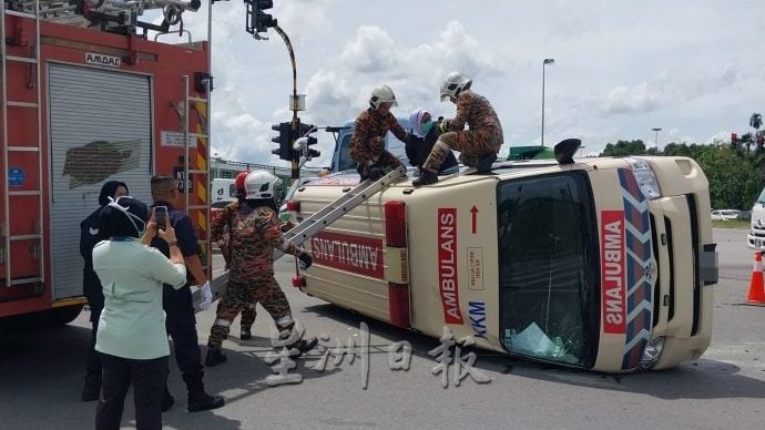隶属砂中央医院的救护车前往一间社区诊所载病人途中,在交通灯前与一辆轿车相撞,导致救护车侧翻,司机右手臂擦伤、护士轻伤、男医务则无恙。