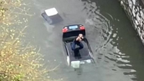 中国江苏泰州市发生惊险事件,一辆轿车为避开一名突闯红灯的老妇,意外坠入河中,车内人员被困,所幸危急时刻,一名男子果断跳入河中,攀爬至车顶用力砸破天窗,将被困者救出,英勇行为瞬间获赞!