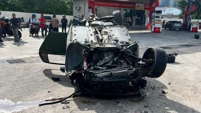 轿车腾空转圈重摔地面 引擎轮胎保险杠散落一地