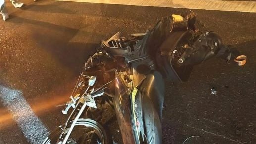 摩托车与轿车发生碰撞,导致骑士身受重伤毙命当场。