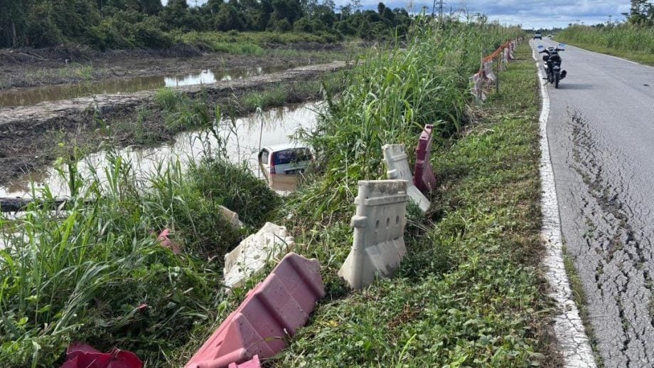 马鲁帝对岸靠近马鲁帝大桥路段今午发生一宗惊险意外。一辆行驶中的轿车疑因爆胎失控,猛然冲出车道,直接跌入积水的深沟内。车内3名成年人与2名孩童所幸及时逃生,无人受困。