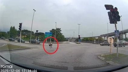 两名男童骑着蚊型脚车在马路上“飞驰”,甚至危险闯红灯,其中一人因来不及通过路口,险些被一辆轿车撞飞。