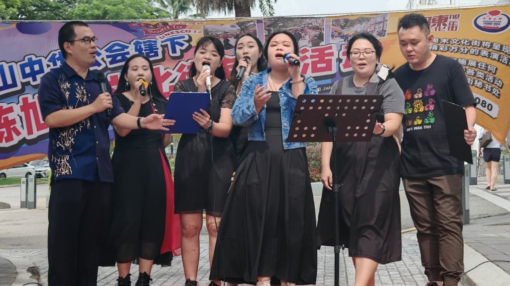 (新山16日讯)老师不止教书育人,同时还能歌声动人!7名新山华小教师今日在新山陈旭年文化街开唱,为民众献上多首好曲。